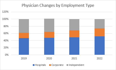 We track this in the strategy research that we do for our clients and I was surprised to see that independent facilities were declining. This may be because physicians realize that the risk involved with managing a facility is very high and that working for corporate facility that is not a hospital may be a better option. While hospitals still employ the most physicians at slightly higher than 52% in 2022, corporate entities have been increasing their segment. Cain reports that the growth for corporate entities has mostly come from the southern part of the US, growing by greater than 50%.